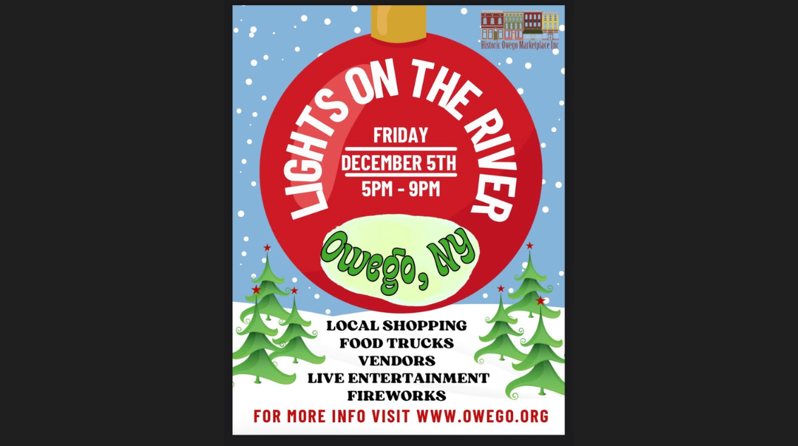 "Join us for the Lights on the River event in Owego, NY, on December 5th, 2025! Enjoy shopping at local stores, meet Santa, and capture a special holiday photo. The night will end with a fireworks display lighting up the sky. Don’t miss this festive evening of fun and community spirit!"