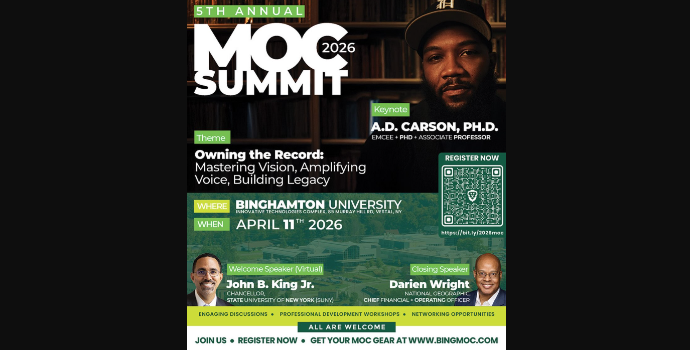 The MOC Summit at Binghamton University invites collegiate & high school scholars, administrators, coordinators, and teachers to step into your power and take ownership of the stories you tell and the spaces you shape. This year’s theme, Owning the Record: Mastering Vision, Amplifying Voice, Building Legacy, challenges you to move beyond representation and toward action—claiming your vision, using your voice with intention, and building something that lasts. Open to all.